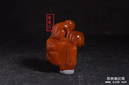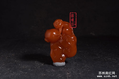 这件南红玛瑙作品结构完整,比例协调,雕工精细,作者仅用几根灵动流畅的线条就将小猴子微蹲于假山之上举着寿桃的画面描绘得栩栩如生。