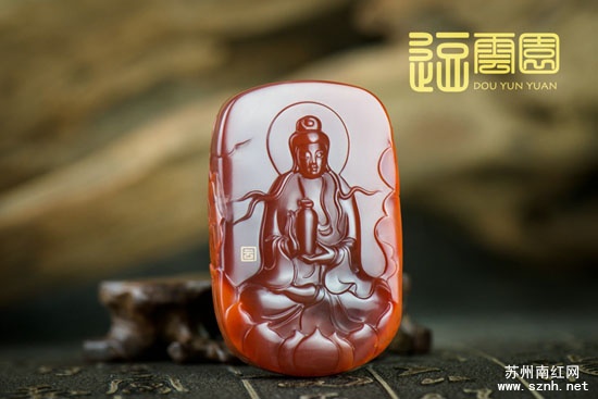 这件南红玛瑙雕件“观自在”雕刻的是一个盘坐在莲花台上的“观音大士”,手捧净瓶,面相祥和,闭目沉思,周围荷叶连绵展,作者运用浮雕的手法,刻画的线条柔和流畅,观音大士的鬓发、衣袖仿佛在微风中飘荡。