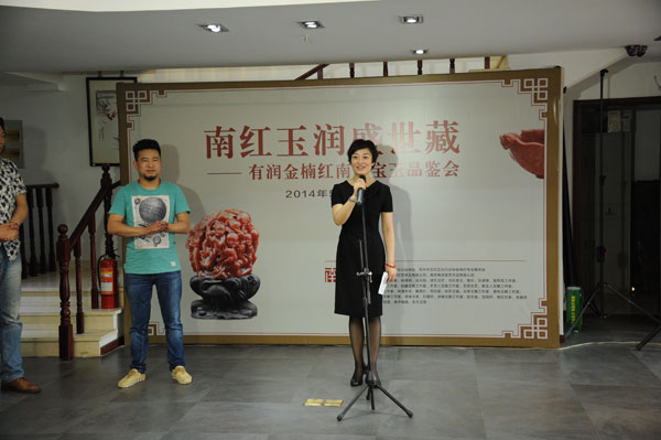 南红玉润盛世藏——有润金楠红宝玉品鉴会于2014年5月25日正式开幕,本次品鉴会由苏州市玉石文化行业协会和苏州市玉石文化行业协会南红专业委员会主办,由南京有润金楠红艺术品有限公司、南京有润堂艺术品有限公司承办,从25日开始至31日结束。在会馆内聚集了大量精美南红玛瑙作品,其中南红专业委员会送予展览的精美南红玛瑙作品达三百多件,为南京市民带来美妙惊艳的红色之旅。